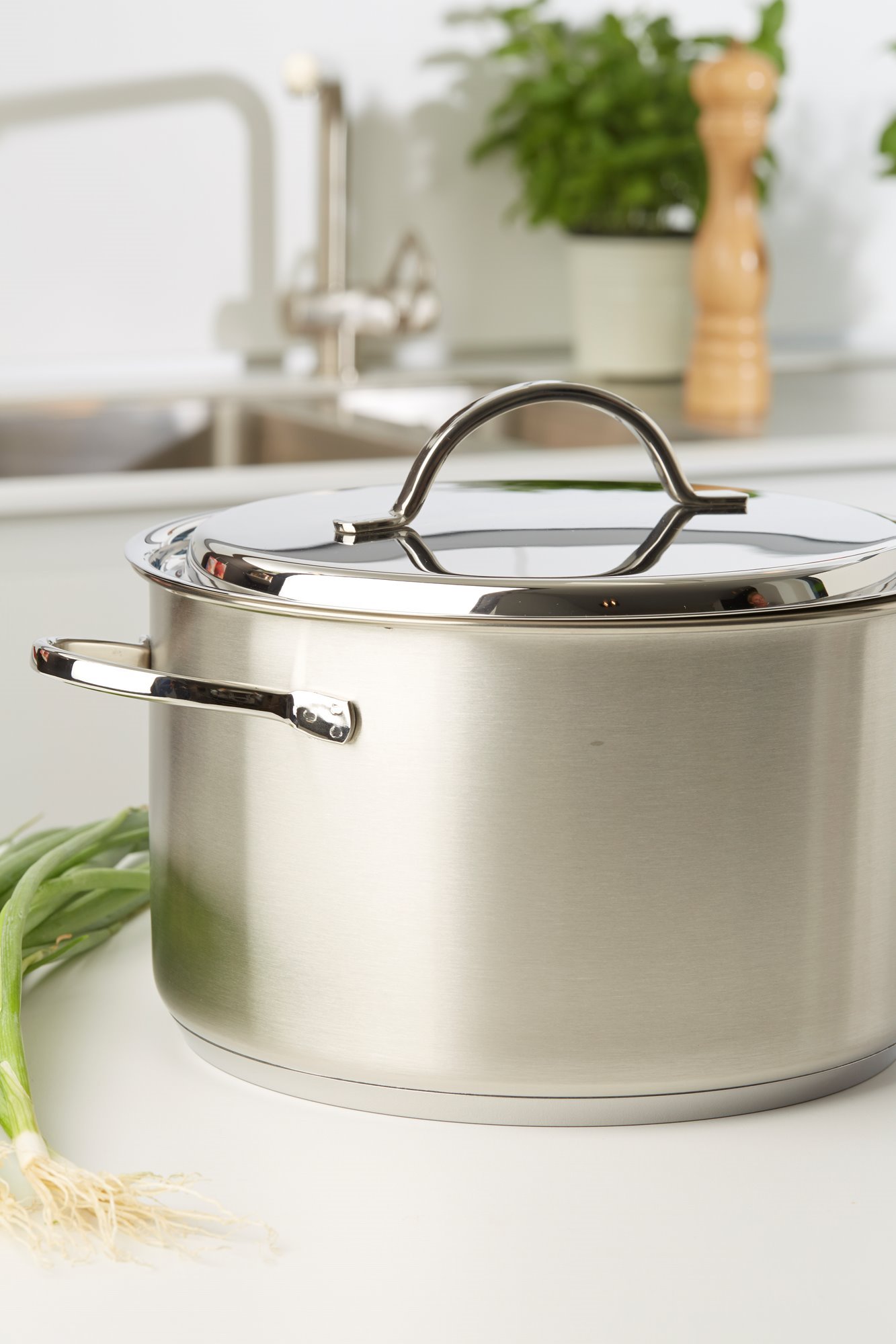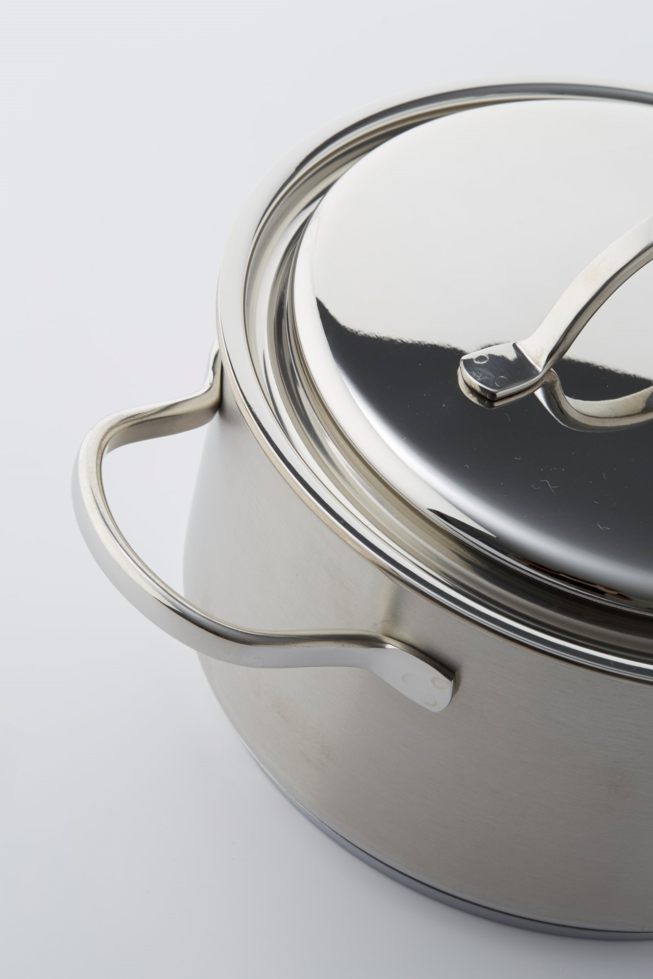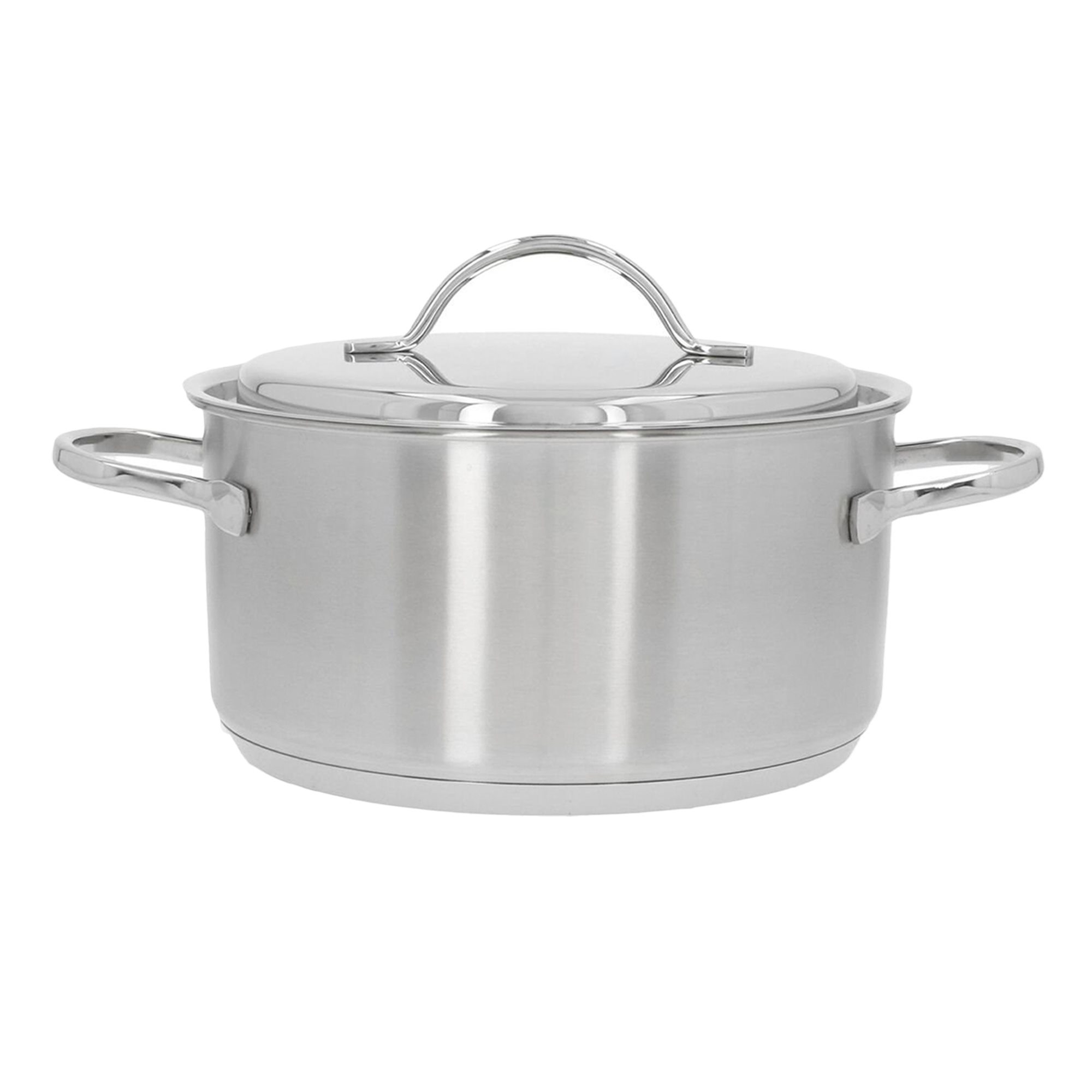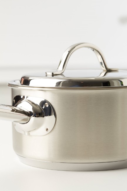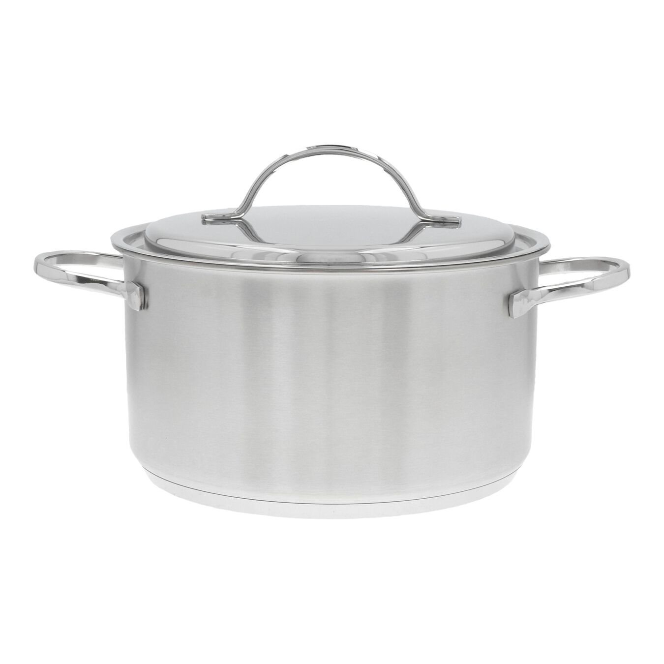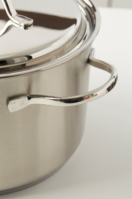 Тенджера с капак, марка Demeyere, 22 см диаметър, 4 л вместимост, изработена от неръждаема стомана 18/10 с матово покритие и заварени дръжки, изработена от неръждаема стомана.