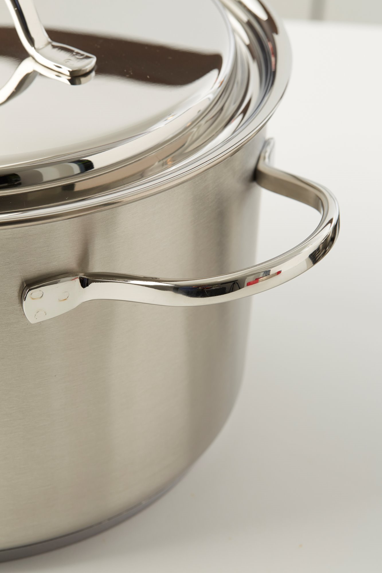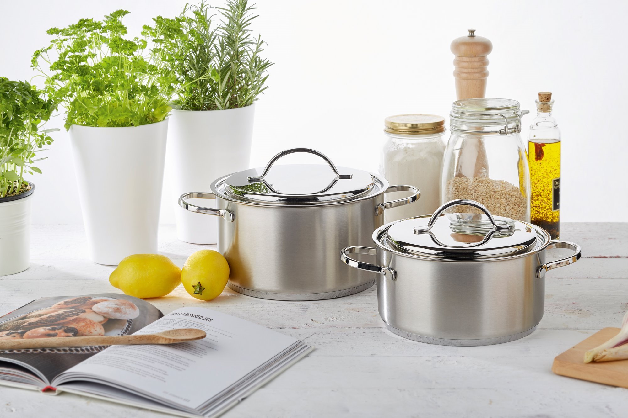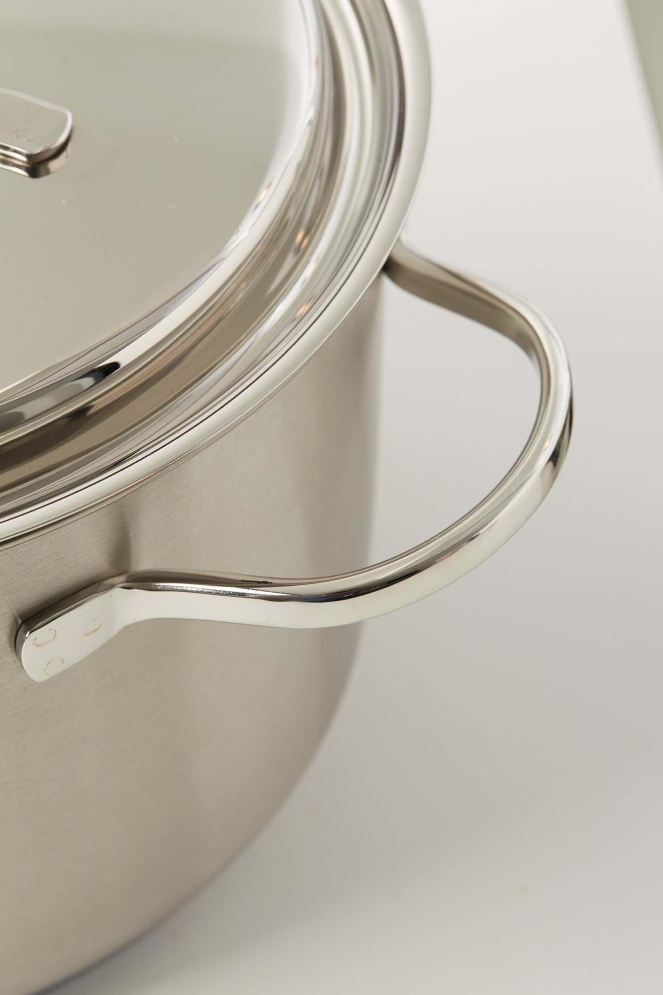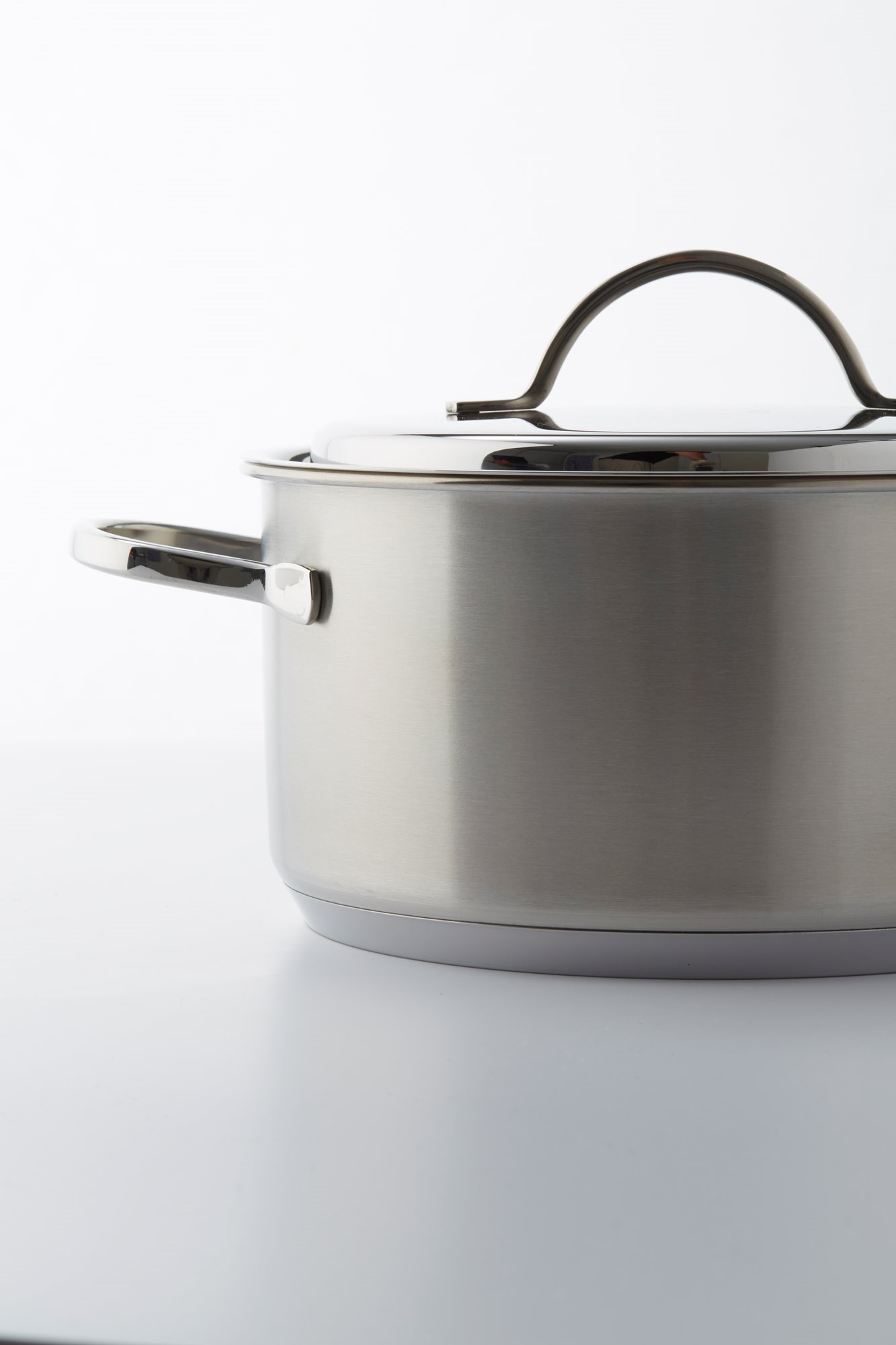 Тенджера с капак, марка Demeyere, 22 см диаметър, 4 л вместимост, изработена от неръждаема стомана 18/10 с матово покритие и заварени дръжки, изработена от неръждаема стомана.