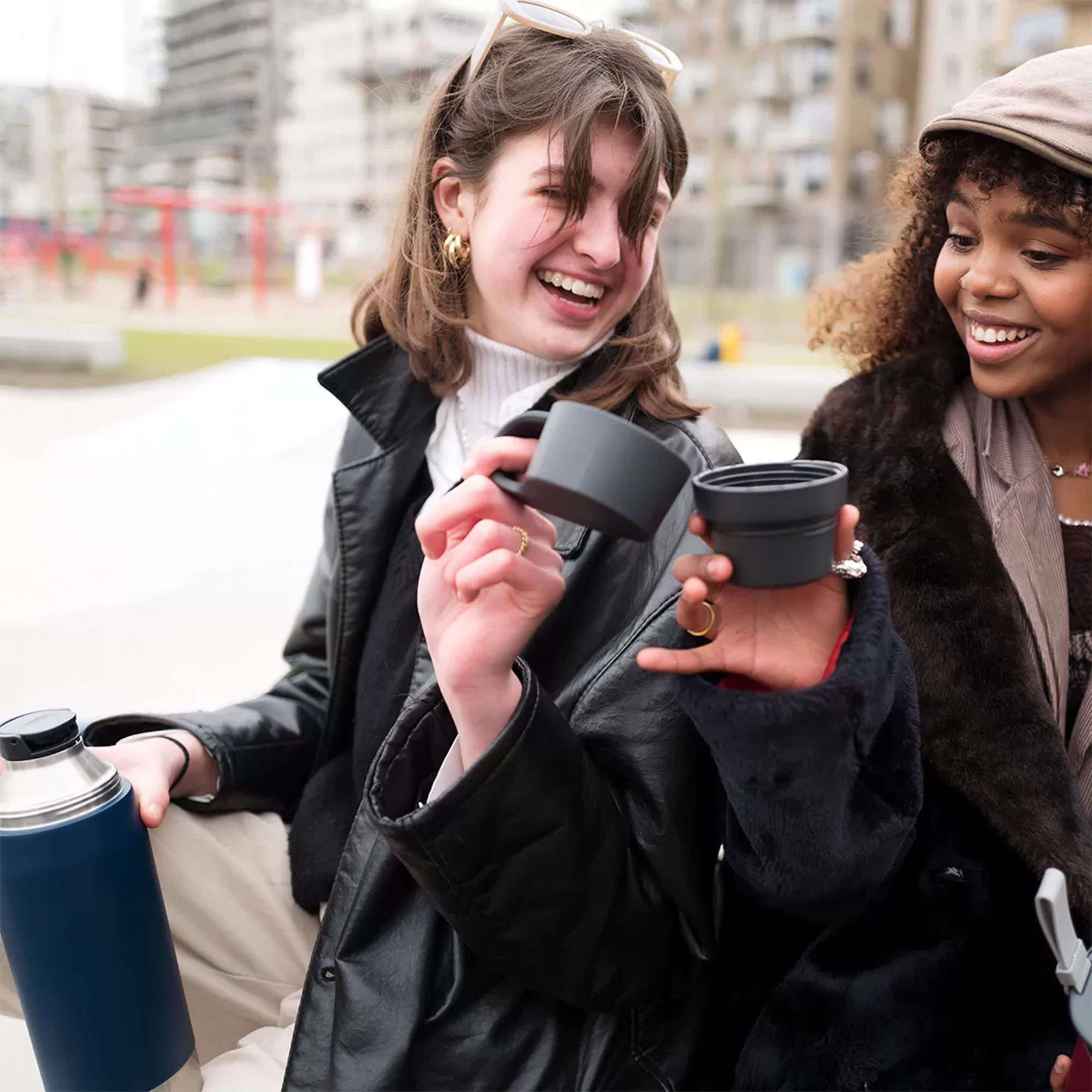 Капакът на термоизолиращата бутилка се състои от две вградени чаши (т.нар TwinCup), така че можете да пиете чай или кафе заедно с близките си. Капакът има вграден бутон за лесно изливане, без да е необходимо да го развийте.