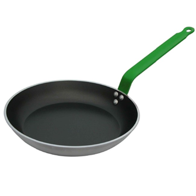 Много устойчивата дръжка е изработена от стомана, закопчава се с нитове, а зеленият цвят показва, че тиганът е подходящ за готвене на зеленчуци.