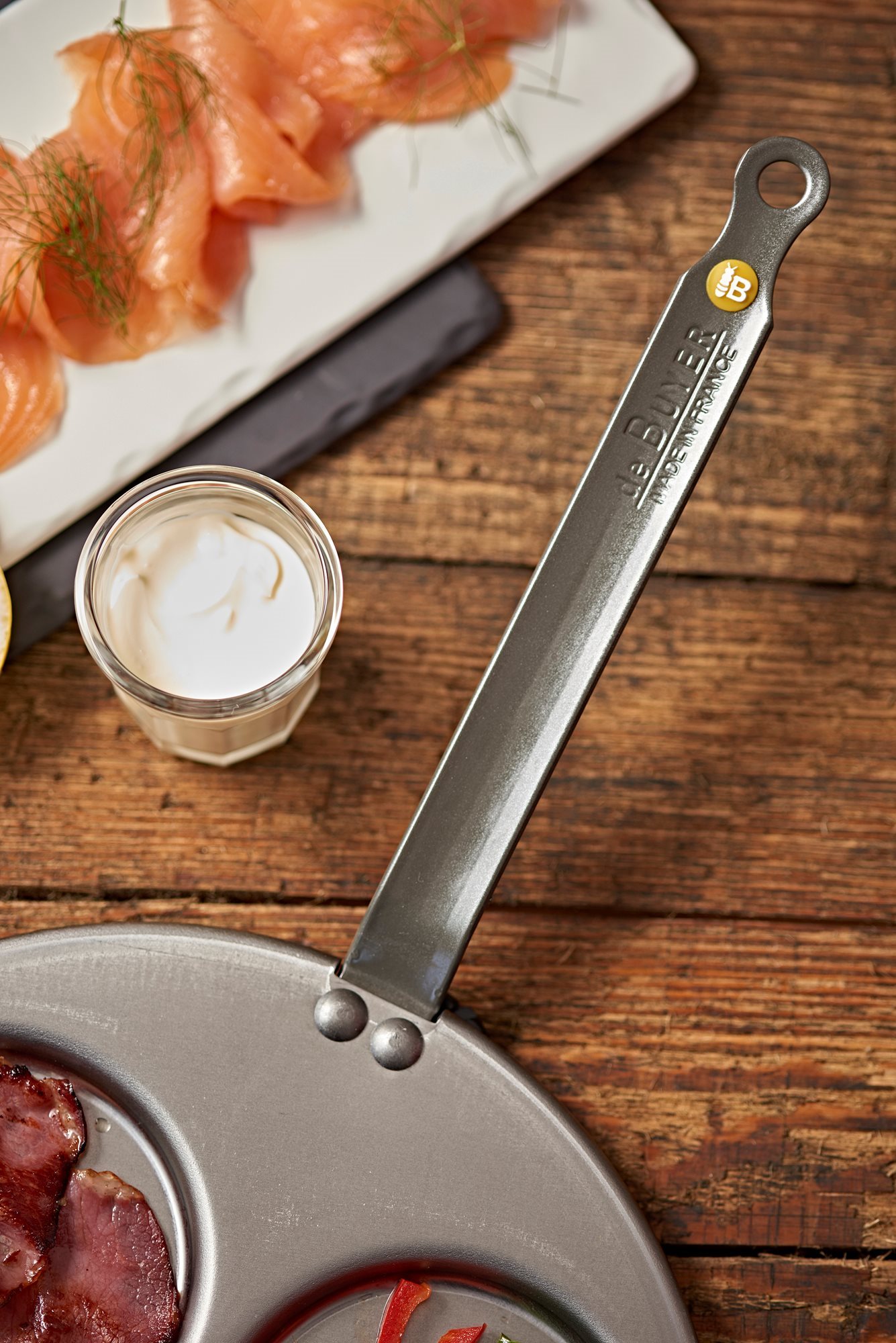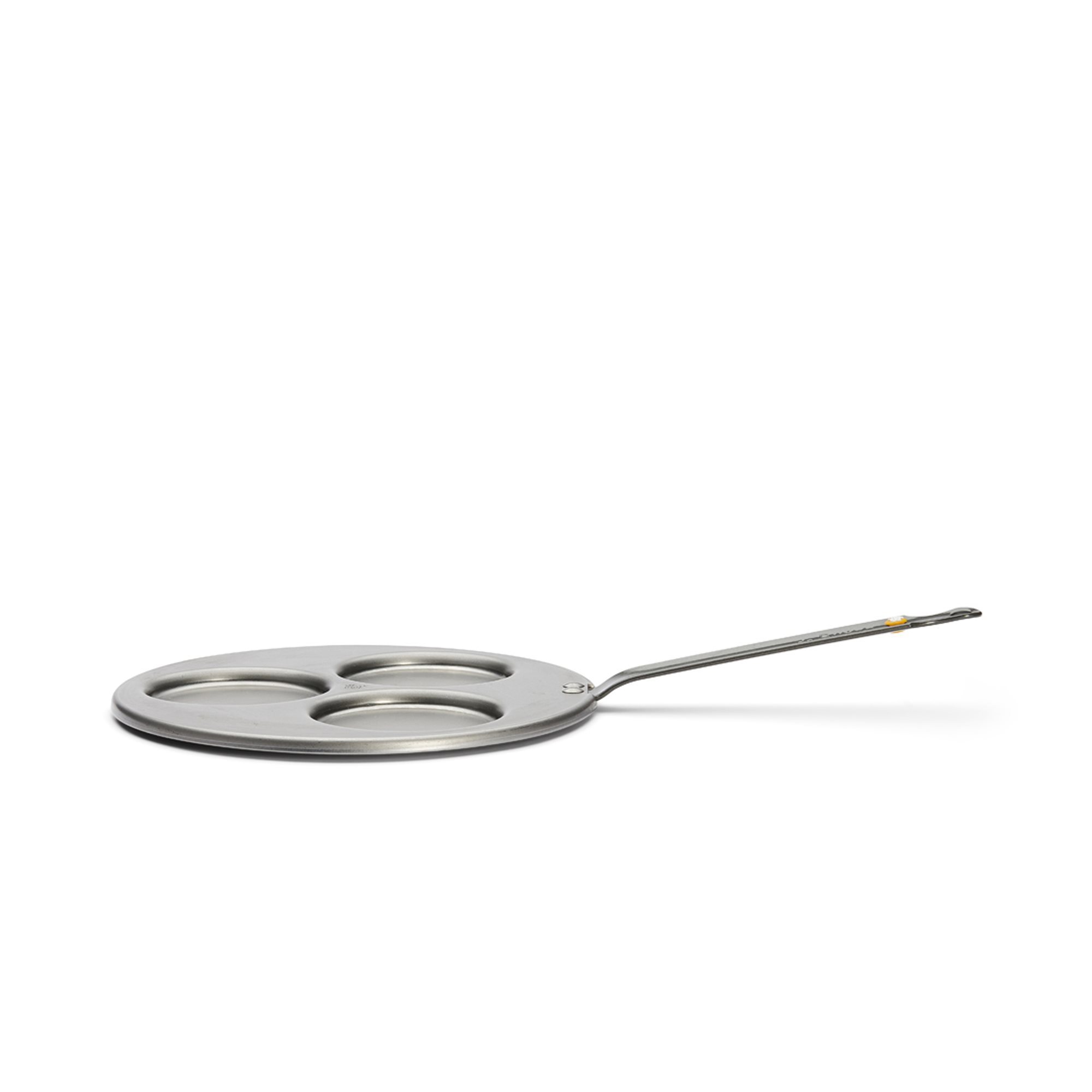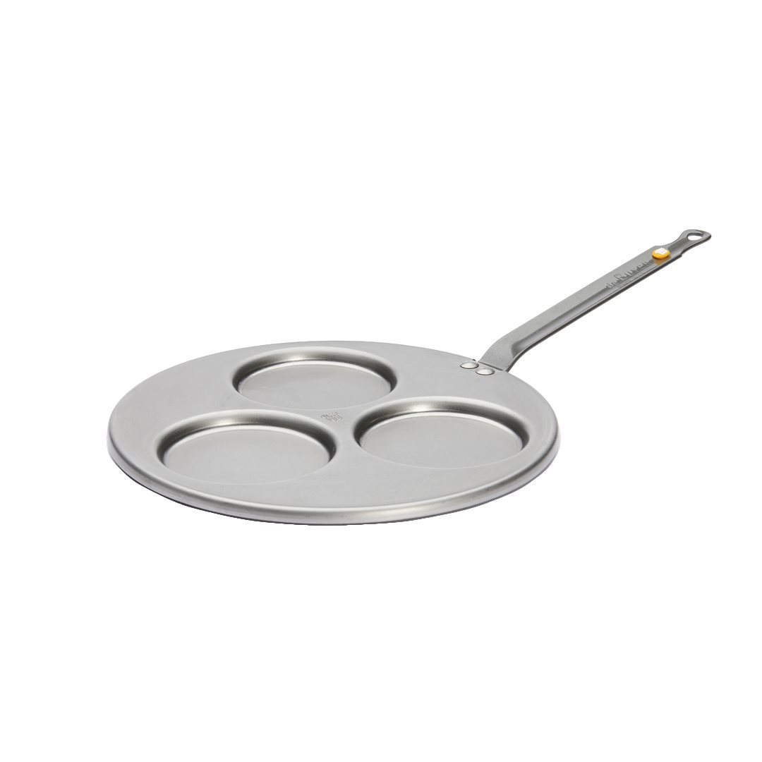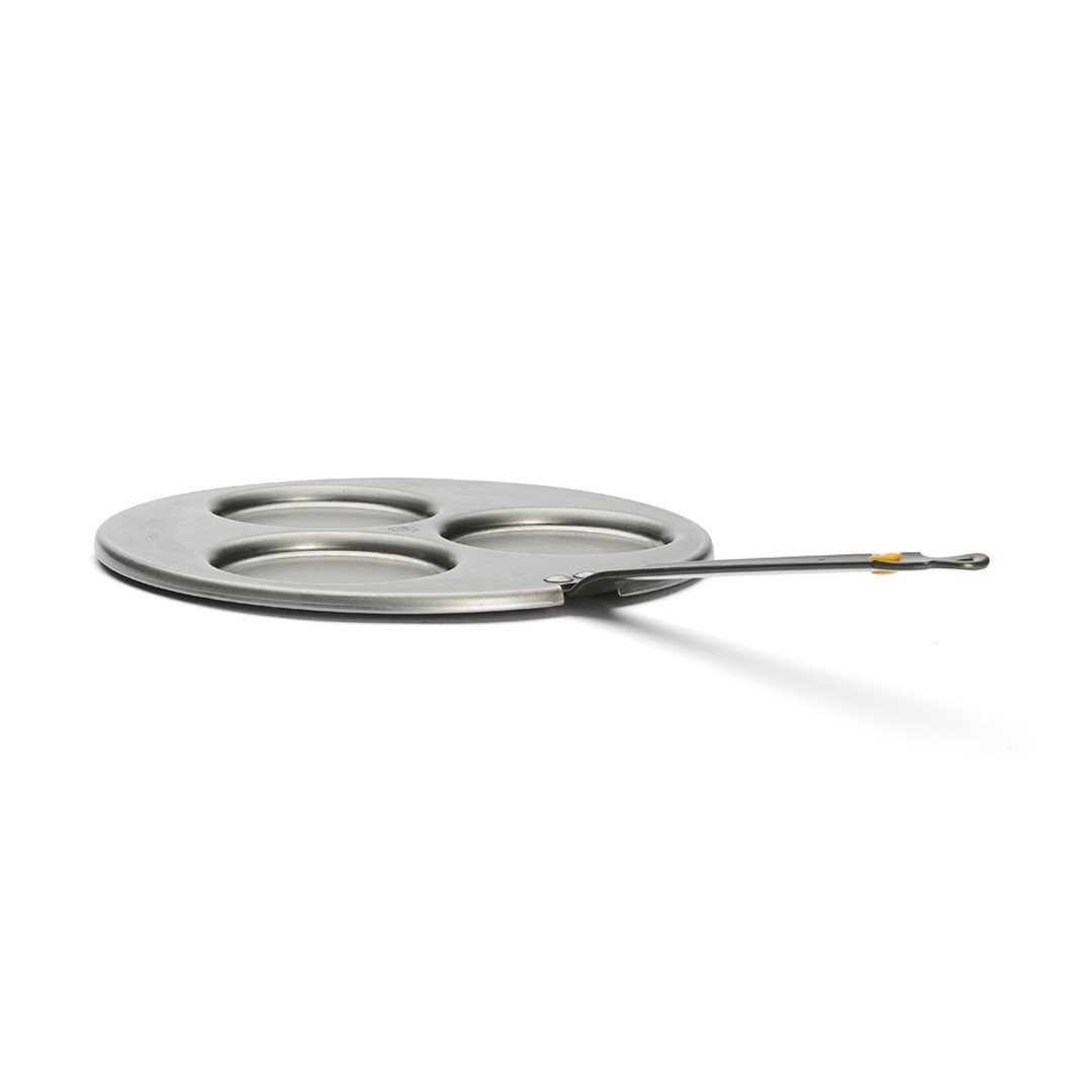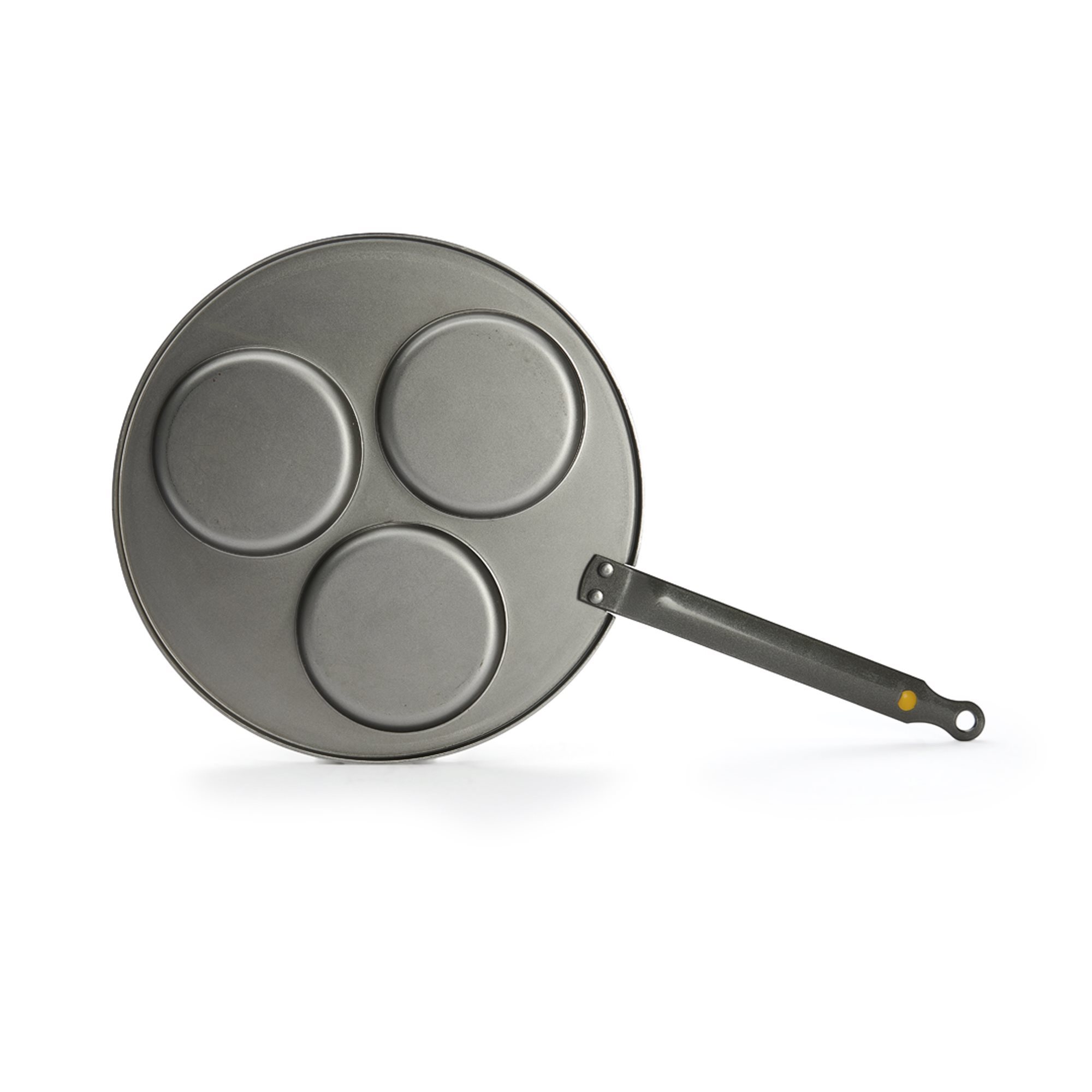 Тиган за палачинки и торти, снабден с 3 отделения с диаметър 10 см, от de Buyer. Тиганът е изработен от висококачествен метал, завършен с покритие против окисляване.