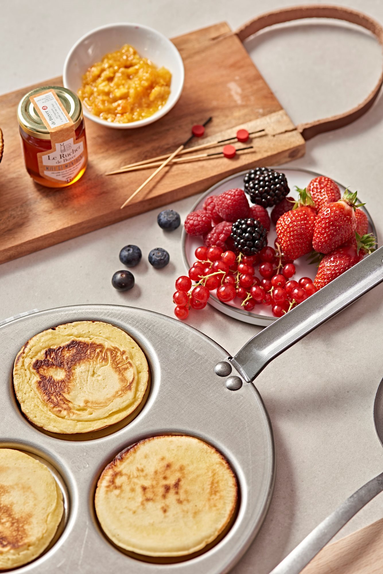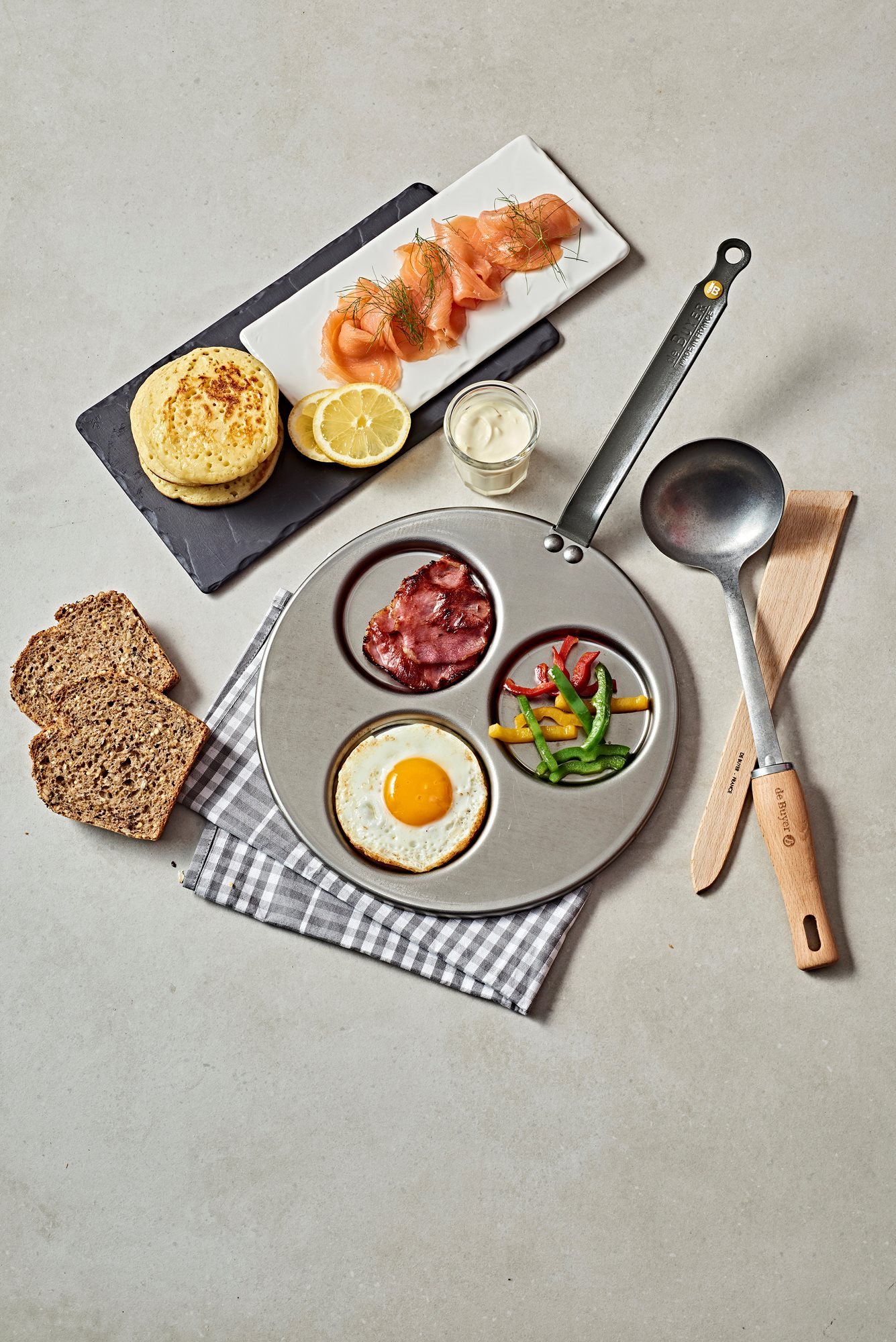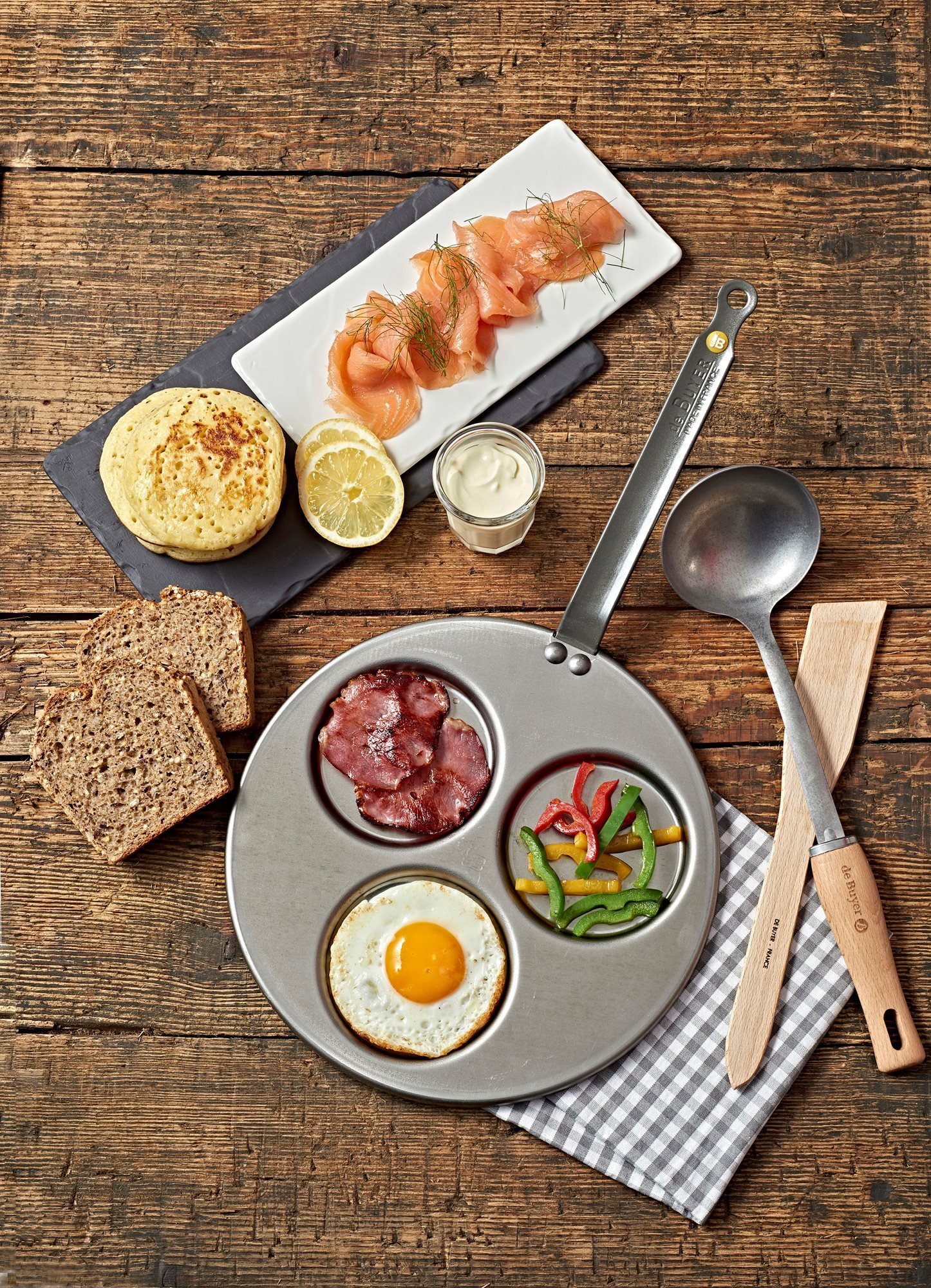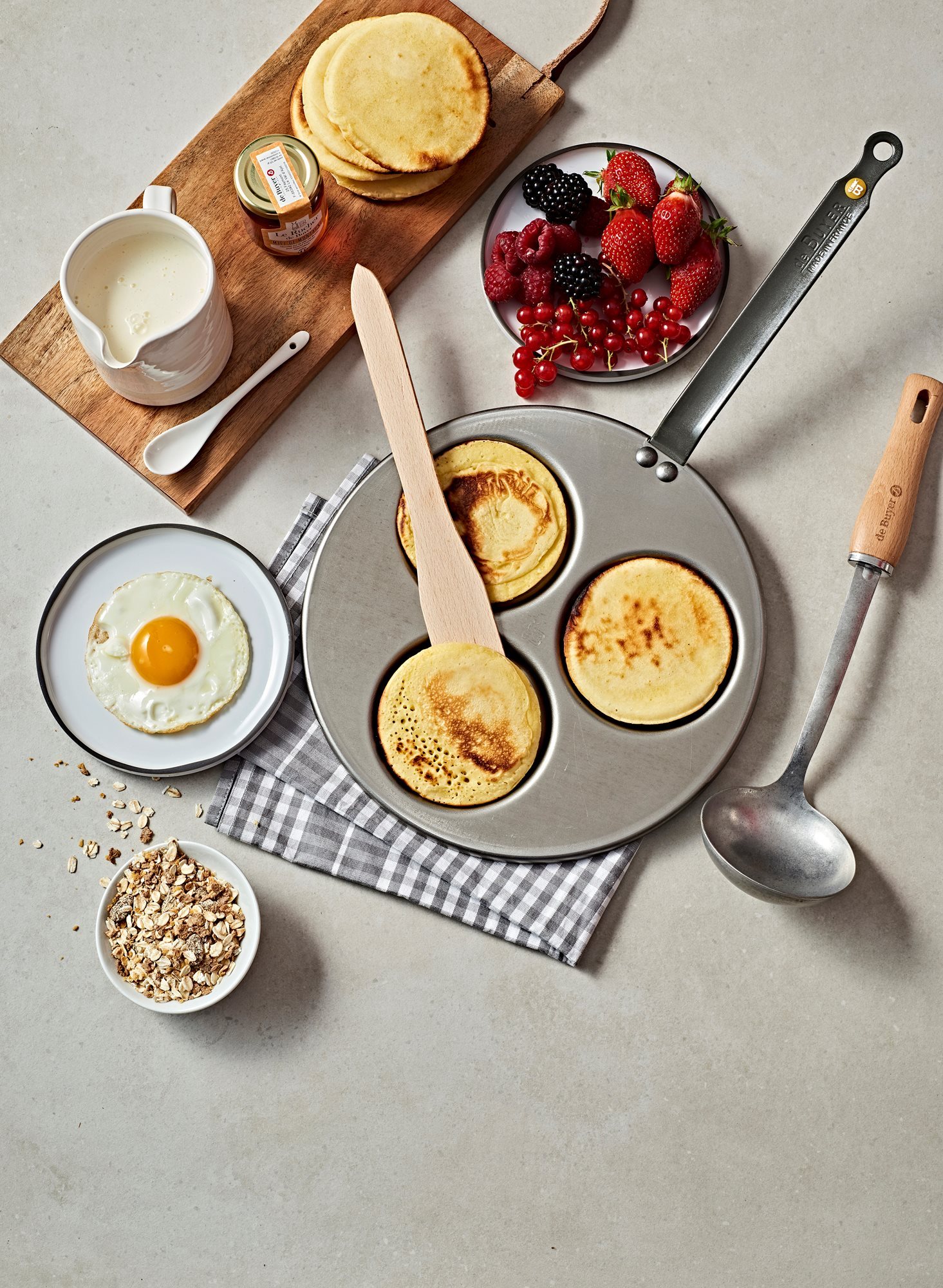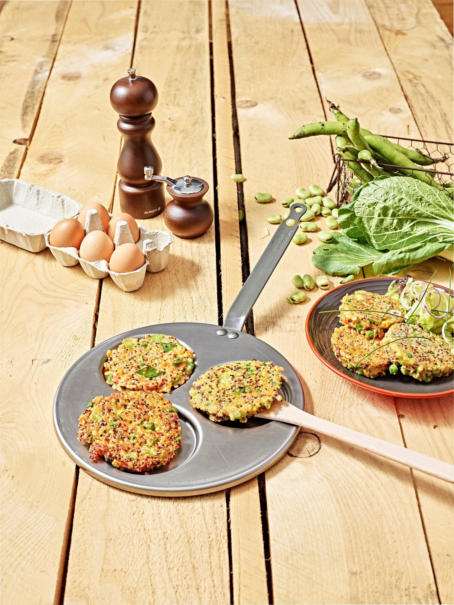 Тиган за палачинки и торти, снабден с 3 отделения с диаметър 10 см, от de Buyer. Тиганът е изработен от висококачествен метал, завършен с покритие против окисляване.