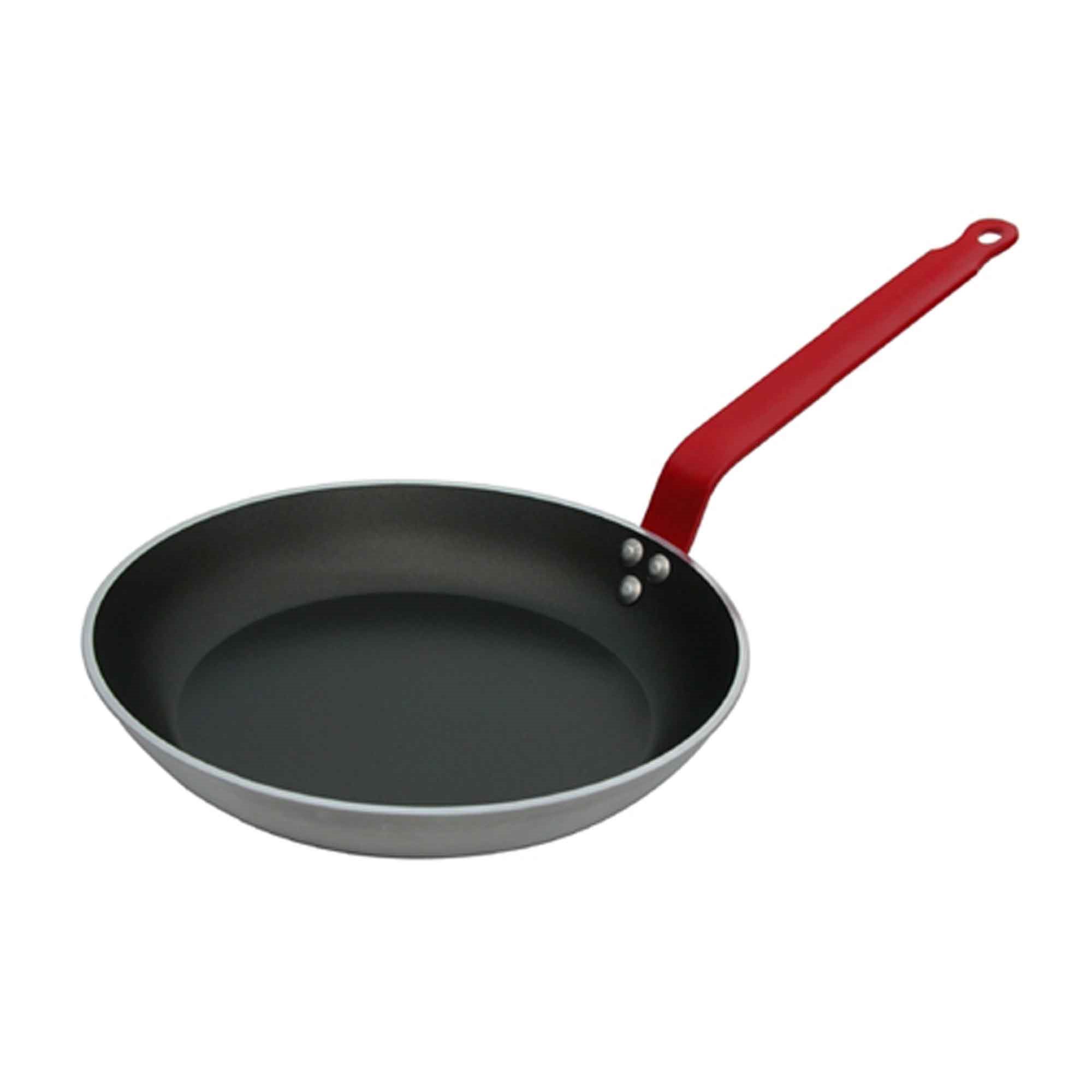 Много издръжливата дръжка на тигана е изработена от стомана и е закрепена с нитове и е покрита с червена смола, устойчива във фурна до 200°C за 10 минути. Червеният цвят показва, че можете да готвите месо с него.