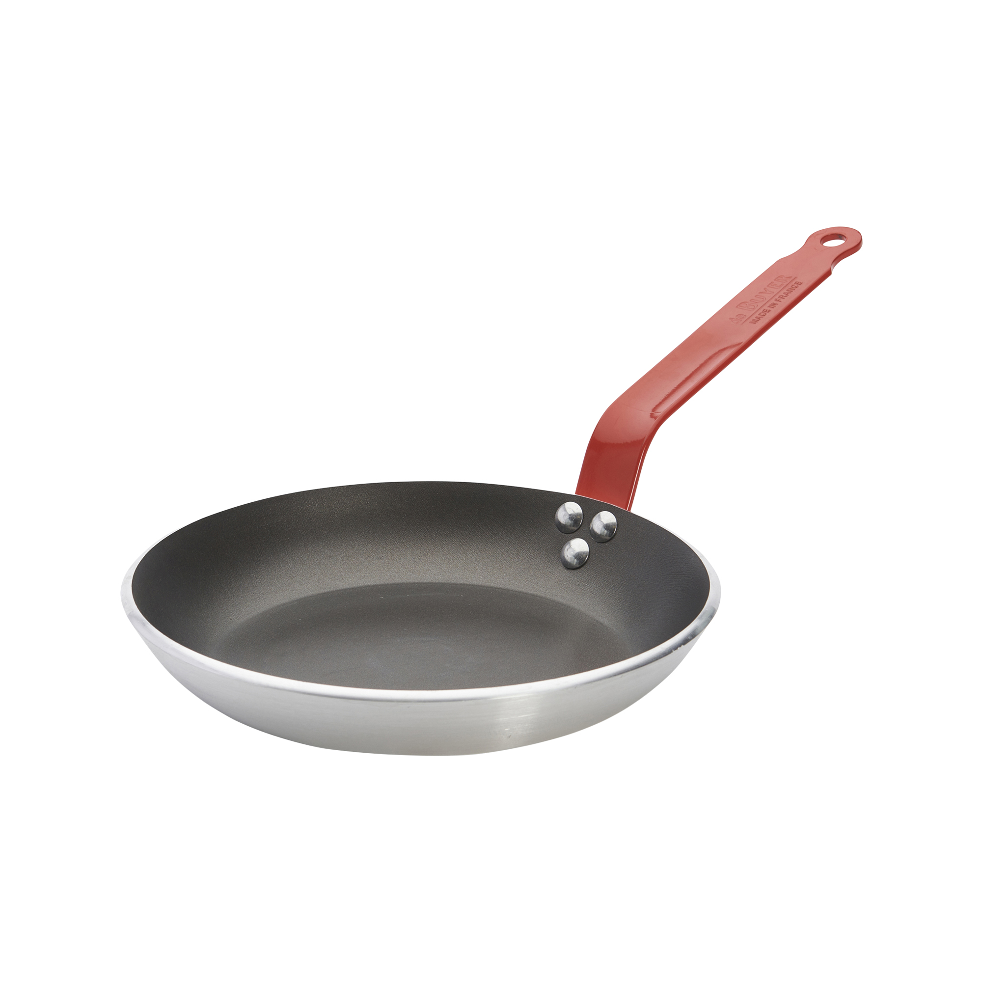 Много устойчивата дръжка на тигана е направена от стомана, закрепва се с нитове и има червен цвят за готвене на месо.