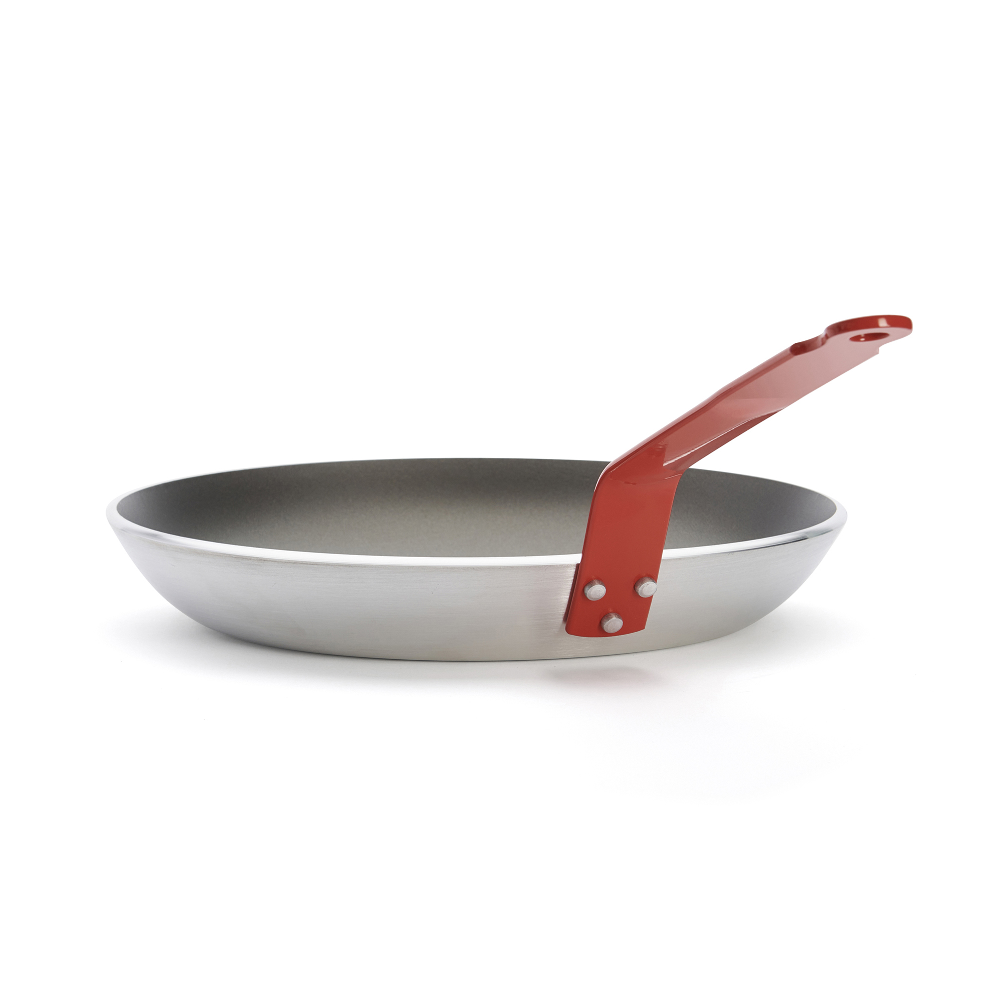 Много устойчивата дръжка на тигана е направена от стомана, закрепва се с нитове и има червен цвят за готвене на месо.