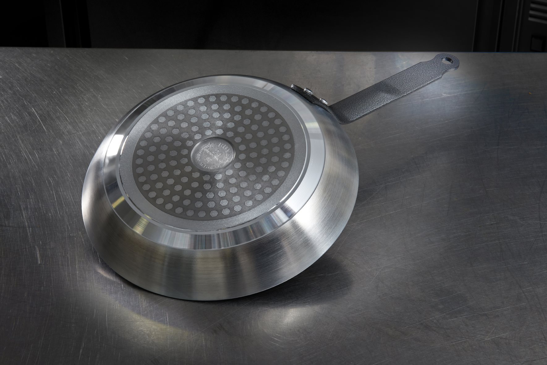 Външната част на тигана има слой от неръждаема стомана, специално предназначен за индукция, със структура от пчелна пчелна пчела, която помага за по-добро разпределение на топлината.