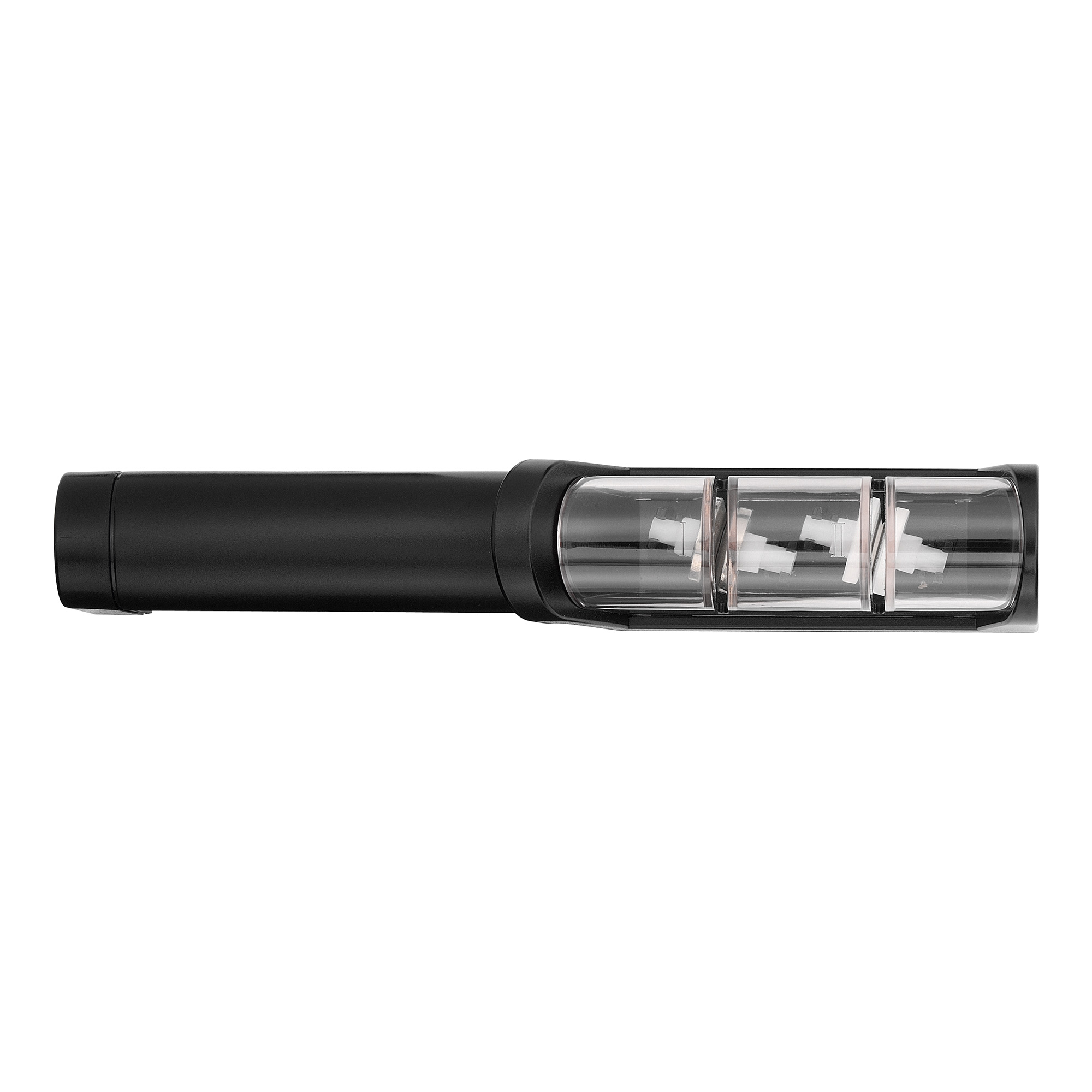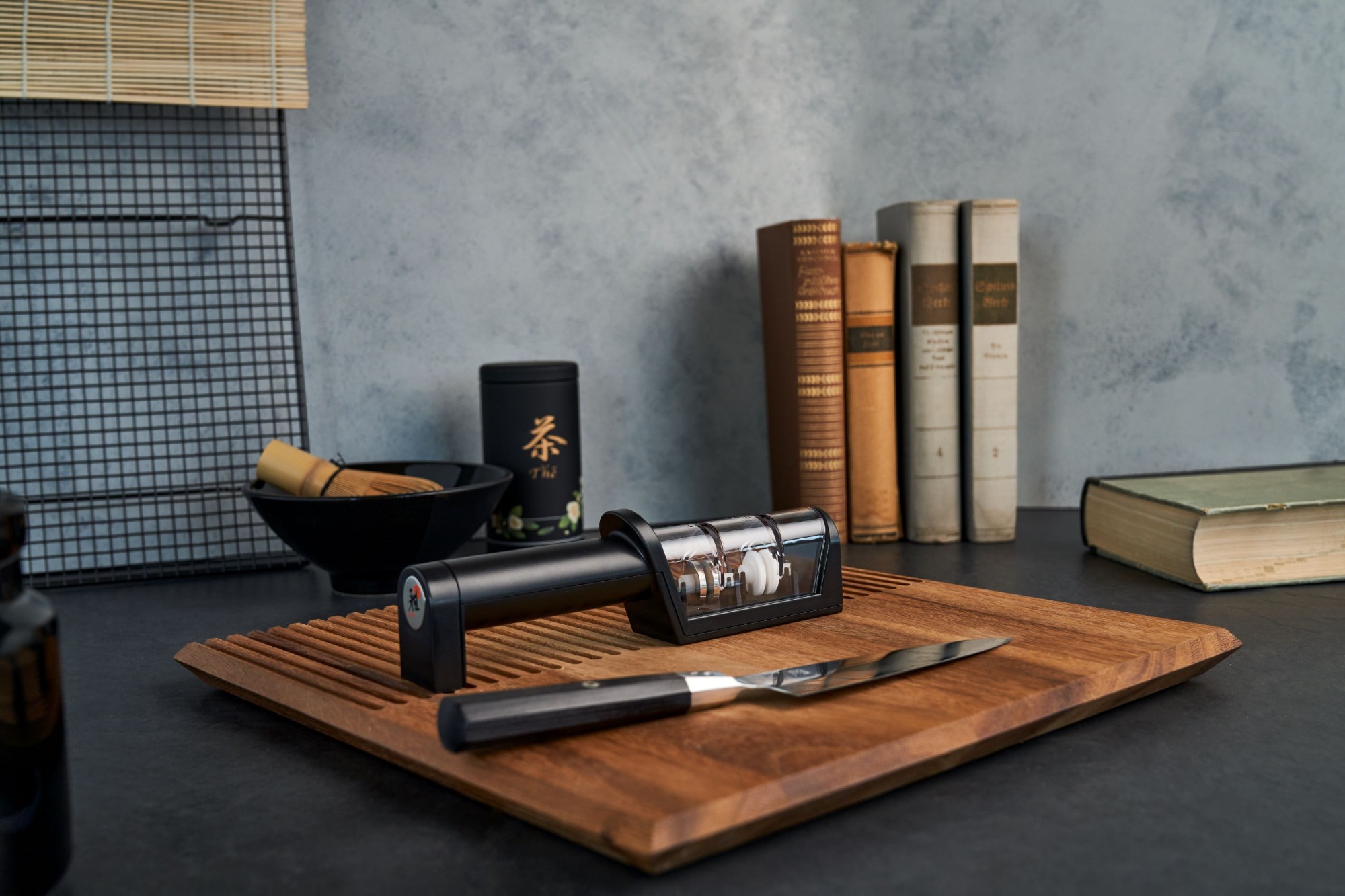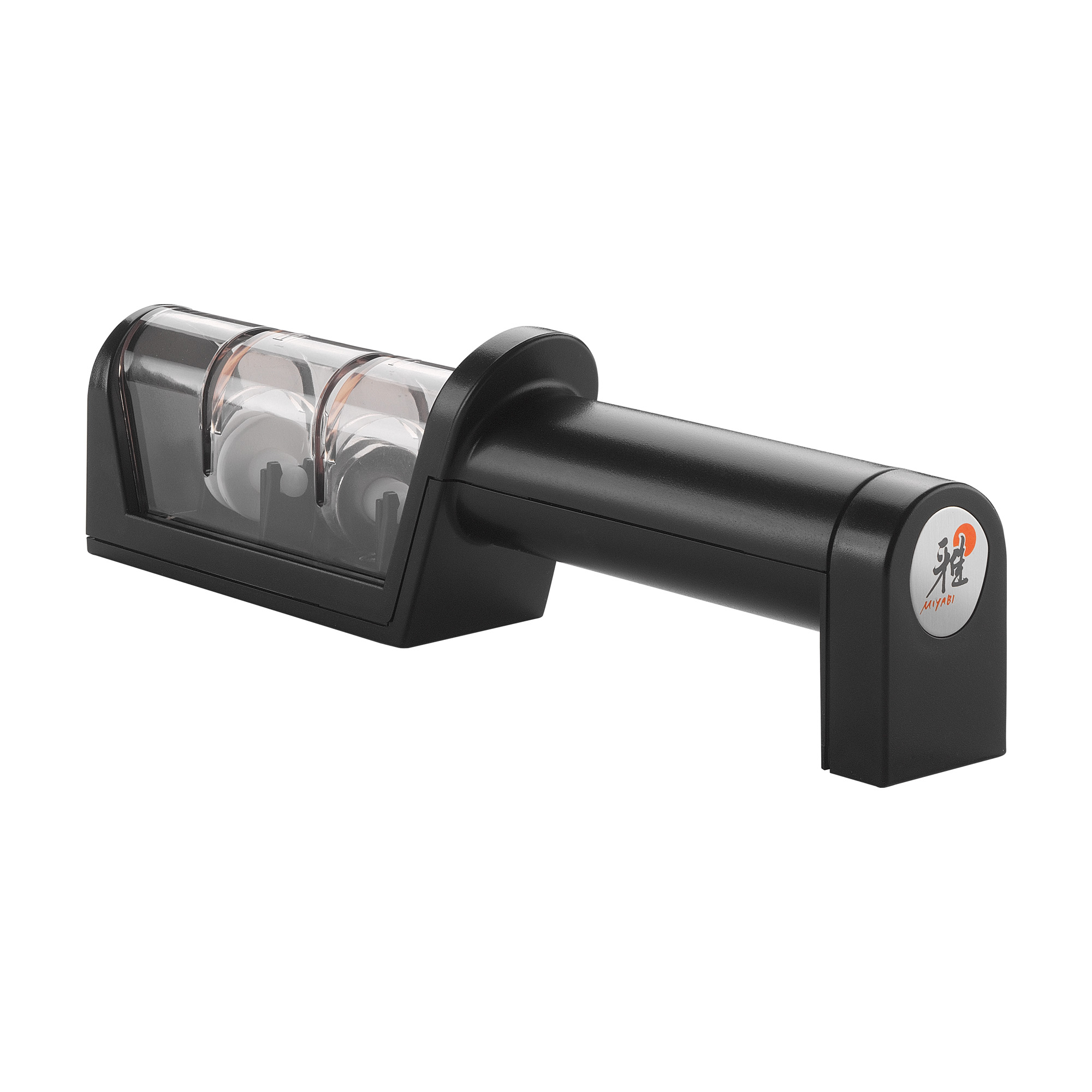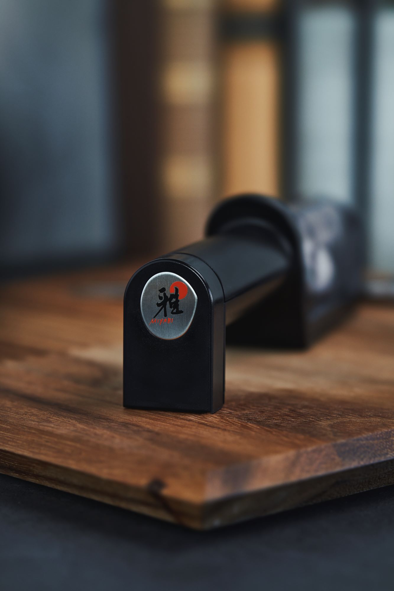 Устройство за заточване на нож, произведено от Мияби, изработено от черен синтетичен материал.