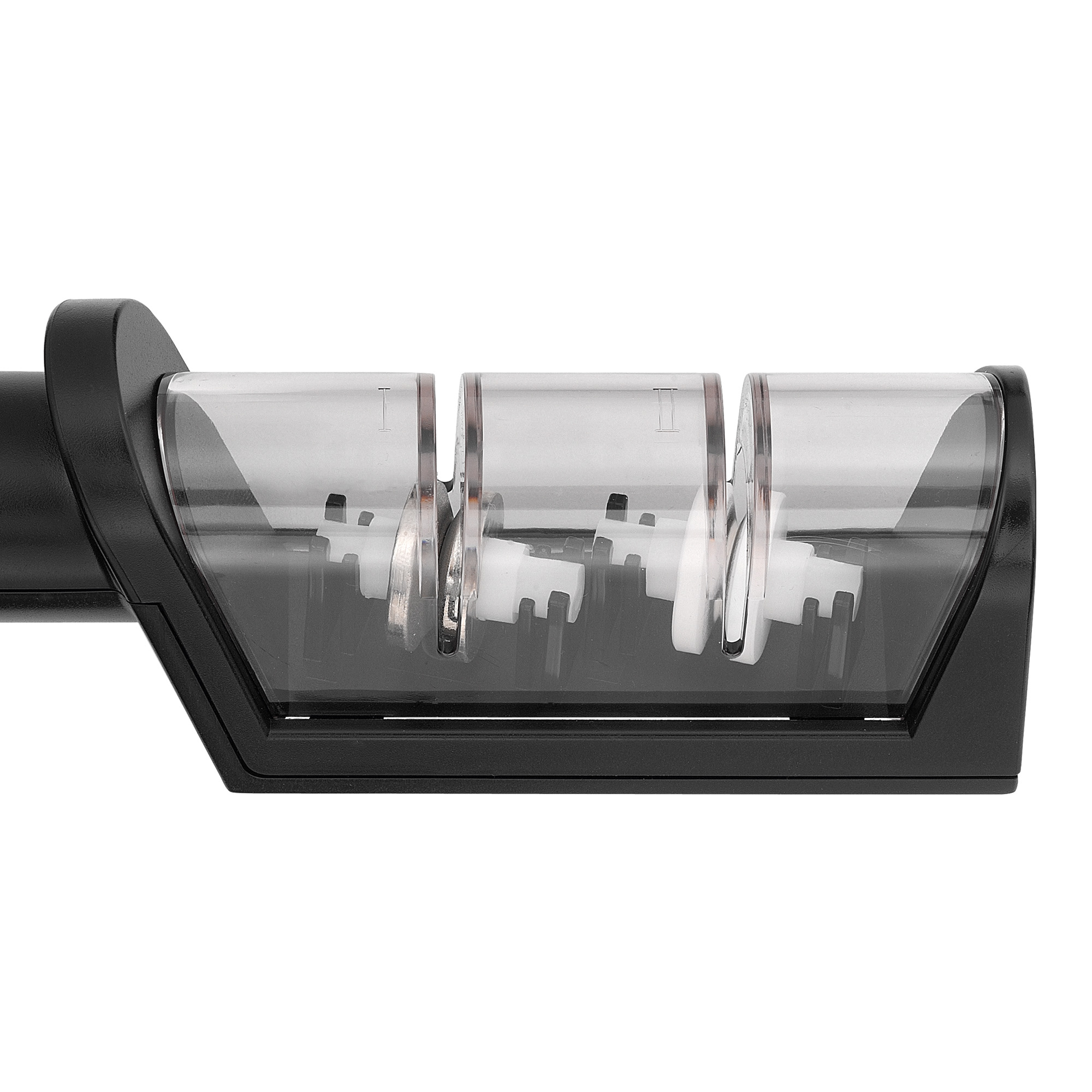 Този продукт има 4 абразивни елемента, монтирани паралелно 2 и 2 в отделението за заточване: 2 направени от стомана с покритие от диаманти за шлифоване на острието и 2, направени от бяла керамика за полиране.