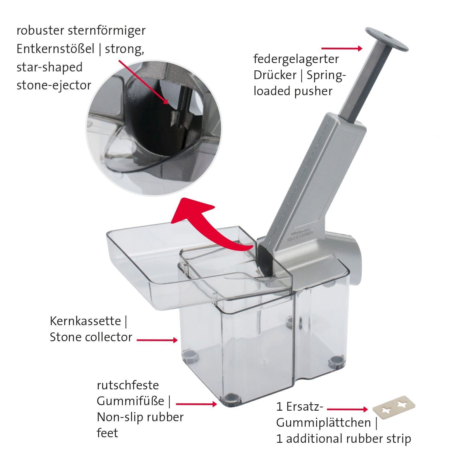 Уред за премахване на костилките на череши марка Westmark от алуминий и пластмаса.