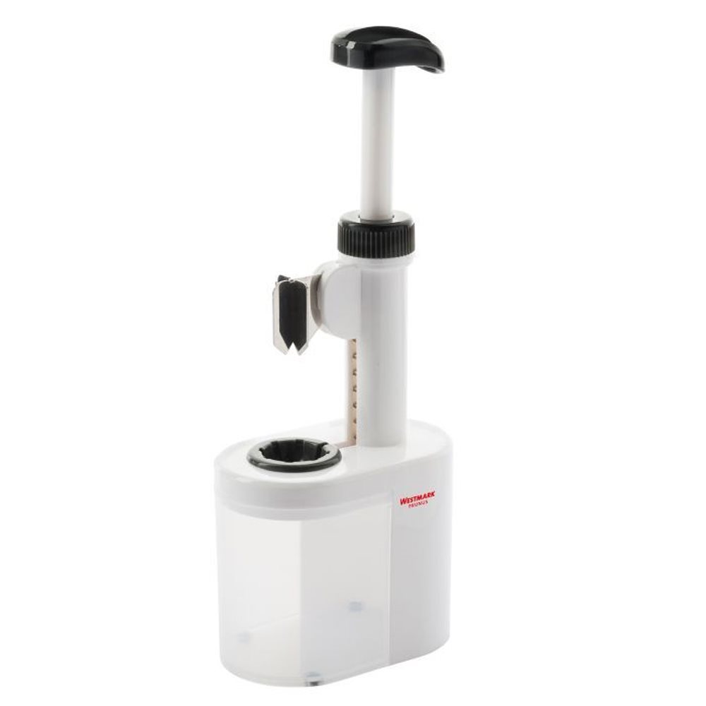 Компактно устройство за премахване на сливите пипсове, марка Westmark, размери 240 x 110 x 65 mm, с полипропиленово тяло и острие от неръждаема стомана.