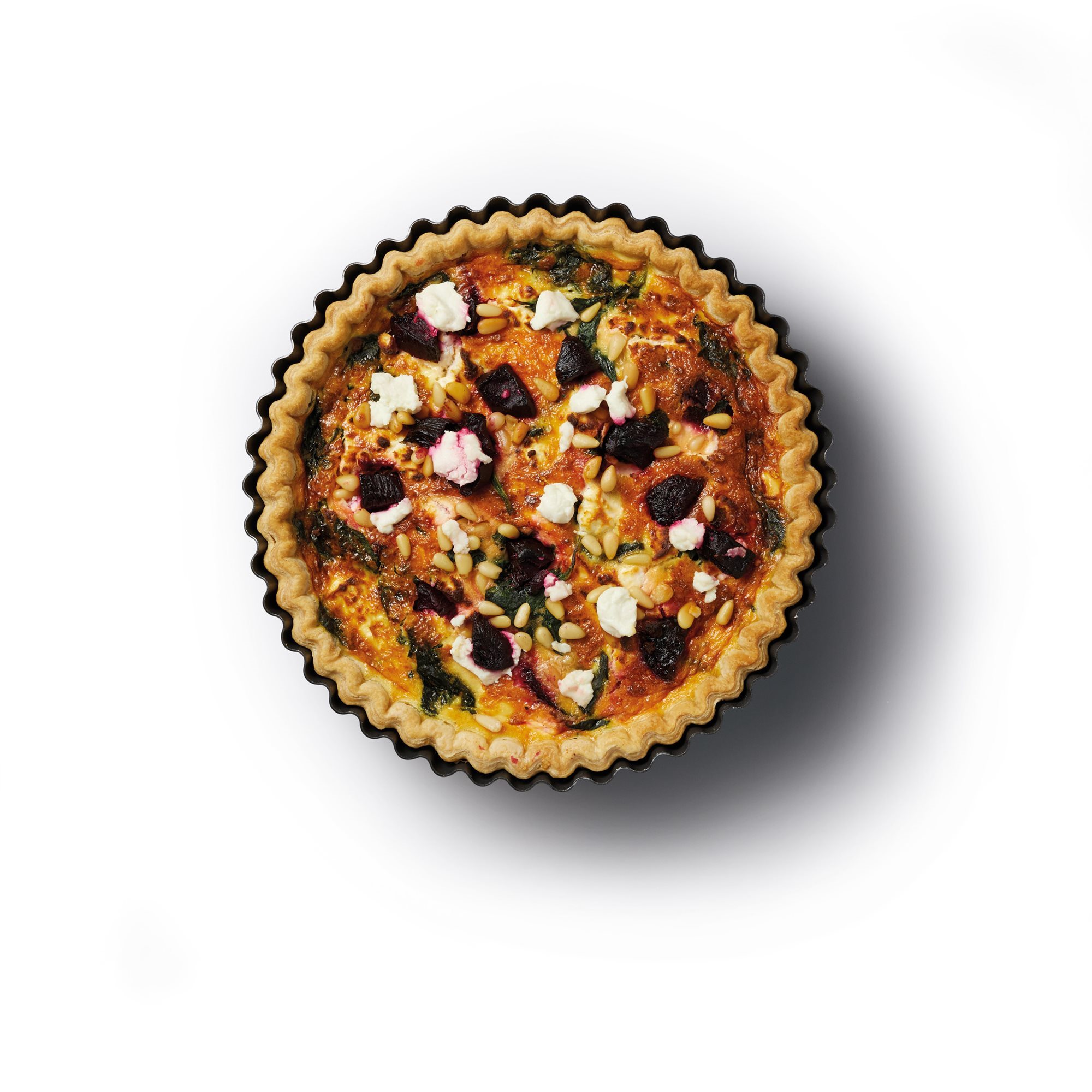 Тавата за печене е идеална за приготвяне на тарти и пайове благодарение на двойното незалепващо покритие , което позволява лесно отделяне на изпечените продукти .