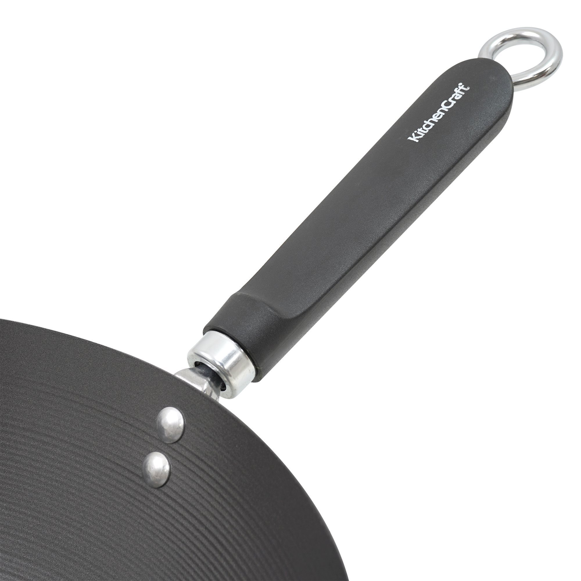 Flat-base wok, марка Kitchen Craft, диаметър 30 см, изработен от дебел въглерод-стомана, с двойно незалепващо палто за лесно почистване.